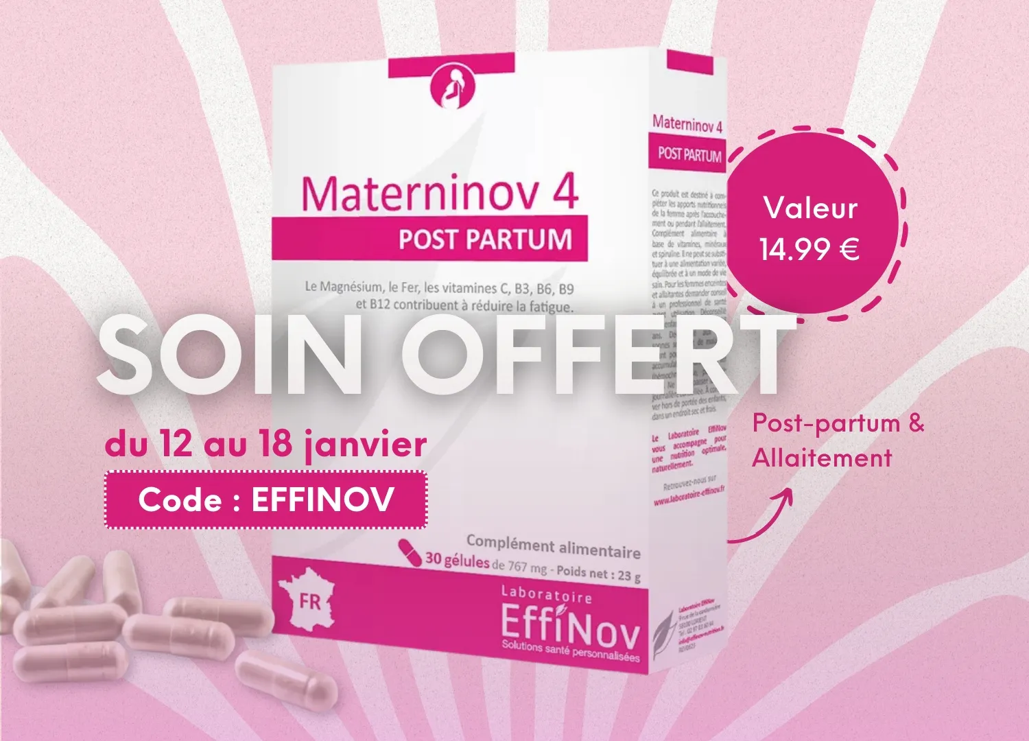 Pour toute commande sans minimum d’achat, une boîte de compléments alimentaires Materninov 4 OFFERTE pour faire le plein de minéraux et vitamines avec le code :